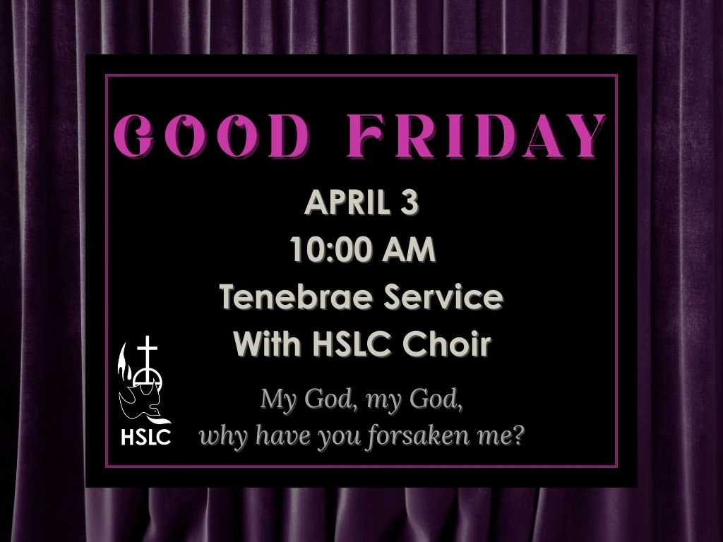 We gather to worship in recognition of Jesus' crucifixion and God's ultimate act of loving mercy. All are welcome to the Tenebrae service, with the HSLC choir providing their voices.