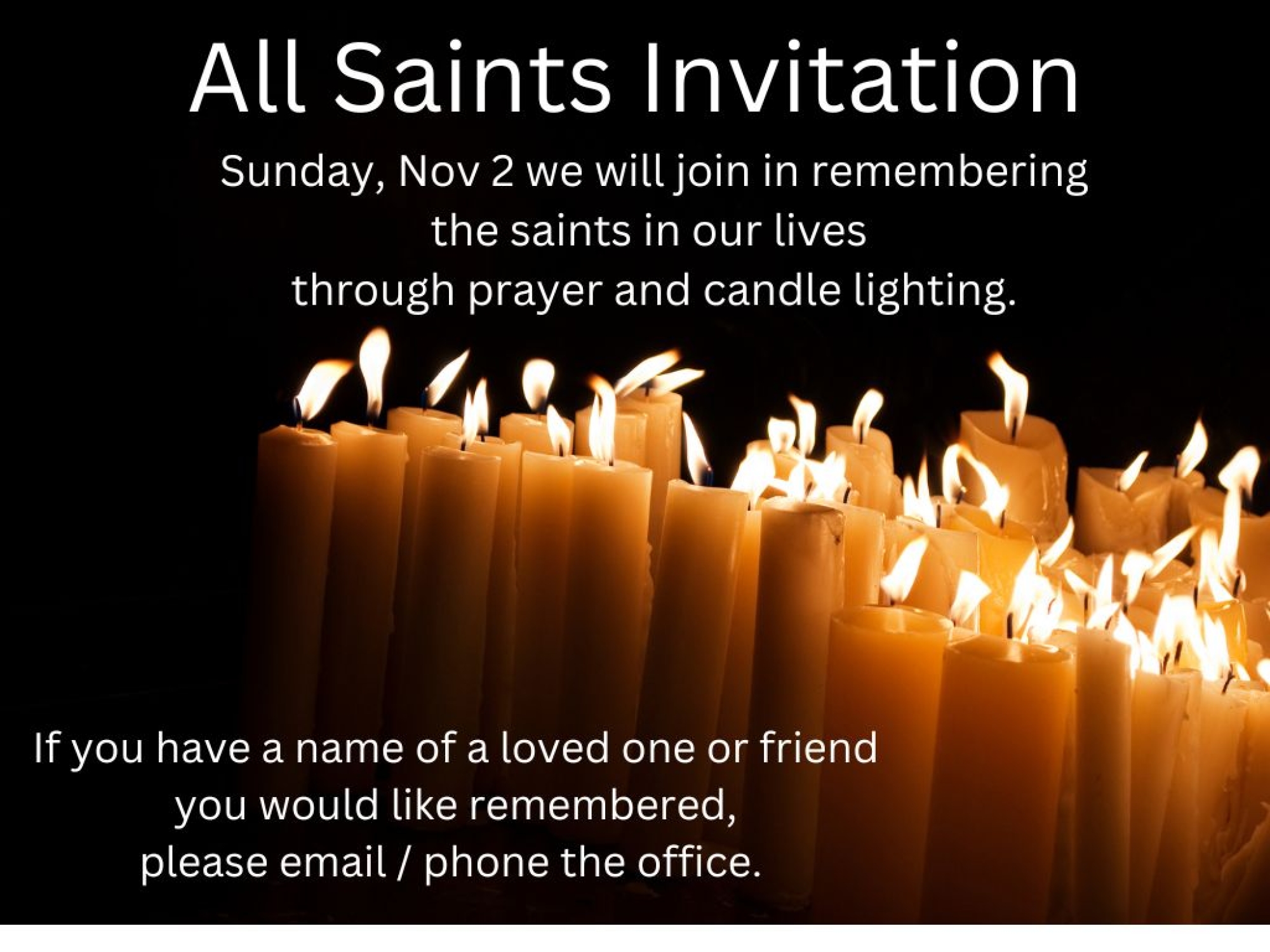 10:00-11:00am, November 2, 2025 10 am Service of Holy Communion with prayer and candle lighting. If you have a name of a loved one or friend who has passed away this last year and you would like remembered, please email / phone the office with their name and a picture (optional)