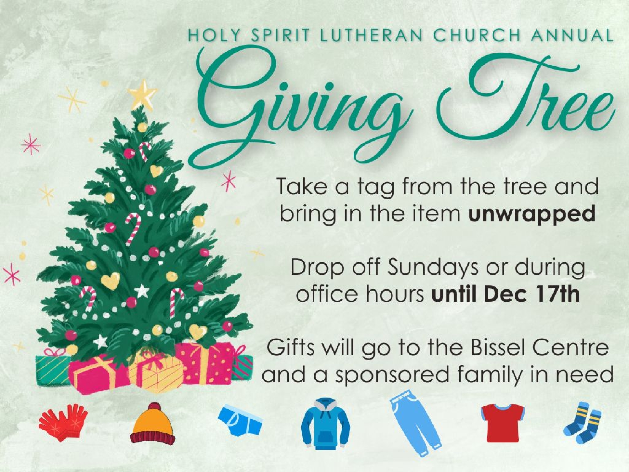 Holy Spirit is continuing our ‘Giving Tree’ tradition! If you’d like to participate, take a tag from our tree, buy the listed item, then bring it back (unwrapped) to put under the tree. These items are then given to people in need in our inner city.