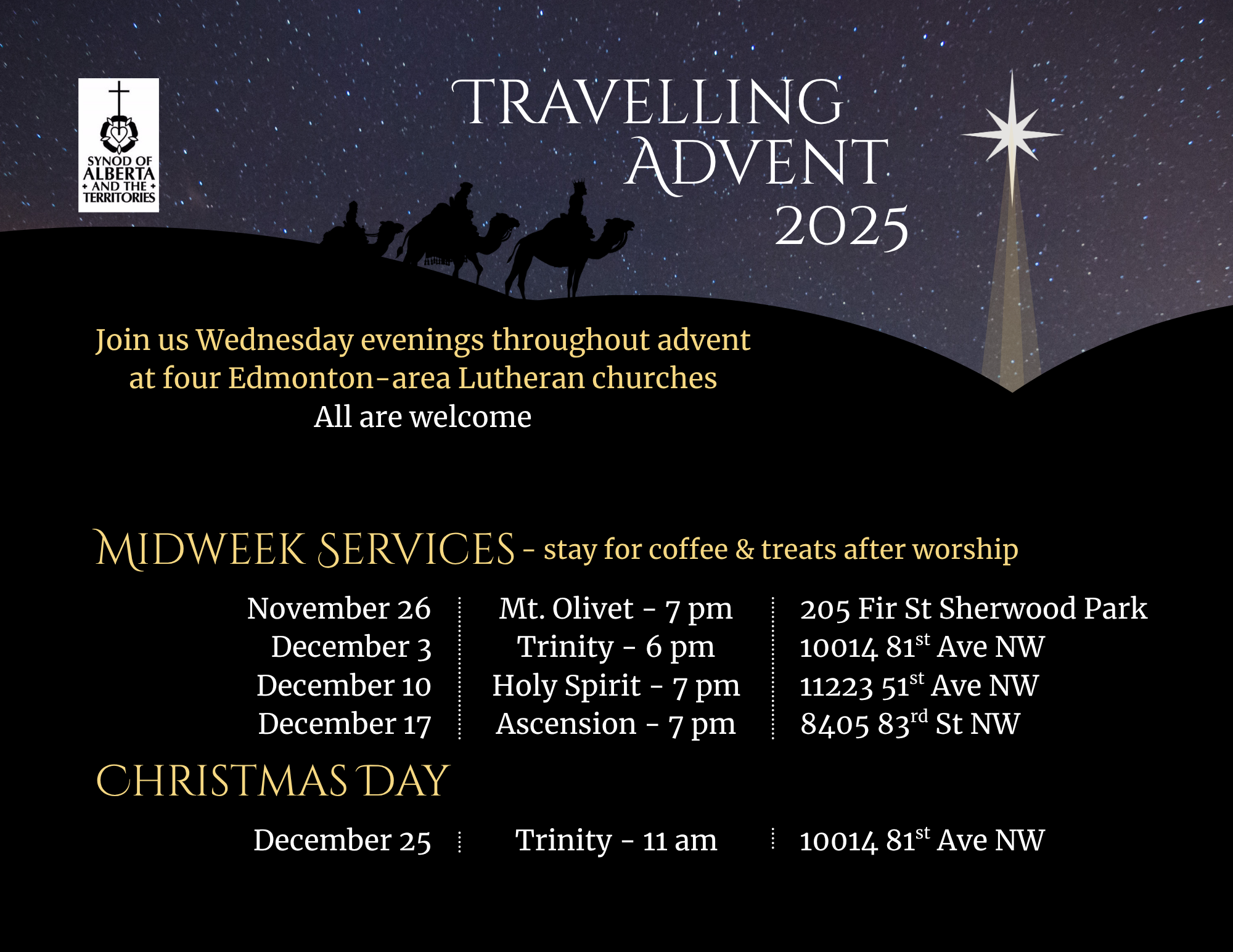 All are welcome to join us Wednesday evenings throughout advent for joint services at four different churches. Stay for coffee and treats after worship!
